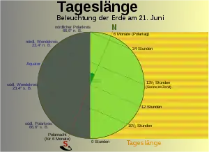 وطبقاً للشكل الذي يمثل وضع الأرض بالنسبة للشمس يوم 21 يونيو عندما يبدأ الصيف في نصف الكرة الأرضية الشمالي، نجد أن النهار يزداد طولا كلما انتقلنا من خط عرض شمالي شمال مدار السرطان. فيصل النهار إلى 24 ساعة عند دائرة عرض 66.5 درجة، أي لا يرى سكان تلك المنطقة الليل. وشمالاً منها حتى القطب الشمالي يطول النهار حتى يصبح 6 أشهر ولا يُرى هناك ليل في الصيف. تنعكس الحالة خلال الشتاء، على دائرة عرض 66.5 شمالاً يطول الليل إلى 24 ساعة ويختفي النهار، وشمالاً عن هذا الخط يصبح ليلاً لمدة 6 أشهر. والعكس بالعكس بالنسبة لنصف الكرة الأرضية الجنوبي.