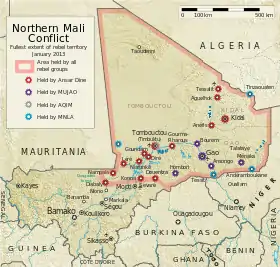 ![]() خريطة المناطق التي يطالب بها المتمردون وهجماتهم، 11 يناير 2013. | |||||||||