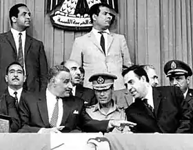![]() القذافي خلال قمة عربية في ليبيا عام 1969، بعد فترة وجيزة من قيام ثورة سبتمبر التي أطاحت بالملك إدريس. يجلس القذافي في المنتصف بلباس عسكري، محاطاً بالرئيس المصري جمال عبد الناصر (يسار) والرئيس السوري نور الدين الأتاسي (يمين) | |||||||