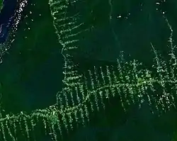هناك نمط شائع لتجزؤ المواطن يحدث في العديد الغابات المطيرة بما فيها غابات الأمازون، نمط "هيكل السمكة" يتكون نتيجة لشق الطرقات داخل الغابة. هذه المشكلة مقلقة بيئياً، ليس فقط بسبب فقدان الحيومات مع العديد من الموارد غير المستغلة والموت الكامل للكائنات الحية، ولكن أيضًا لأن انقراض الأنواع النباتية والحيوانية مرتبط علاقياً بتجزئة المواطن. [15]