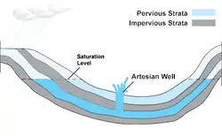 البئْر الارتوازية[1] بئر ينفجر منه الماء تلقائياً وذلك من خلال تسرب مياه الأمطار إلى باطن الأرض من عبر الفجوات الأرضية حيث تتجمع المياه بشكل مضغوط في طبقات الأرض وإذا تبين أن تسرب المياه بين طبقتين إنحصر بينهما فلا يستطيع الصعود أو النزول لأنه محصور بينهما وهما لا ينفذان الماء مطلقا فتتراكم المياه على أبعاد شاسعة من البحيرة التي تسربت منها وعندما يقوم الإنسان بثقب أي جهة من جهات تلك الطبقة وتصادف أن الماء متجمع تحتها إنفجر منها ونبع إلى فوق إلى بعد أمتار محدودة بقدر سطح البحيرة التي نشأ منها.