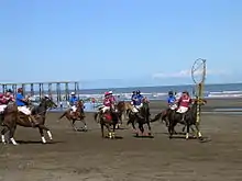 وفي هذه الرياضة تحمل الكرة في يد لاعب من اللاعبين وألذي يركب فوق حصان وثُم يتنقل بها ويحاول إدخالها إلى شبكة تكون موجودة في أرض الملعب وهذه الرياضة تشبه لعبة كرة الحصان وألتي تُلعب في فرنسا و البرتغال.