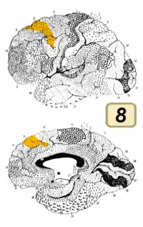 ![]() صورة للدماغ وباحة برودمان الثامنة باللون البرتقالي صورة للدماغ وباحة برودمان الثامنة باللون البرتقالي | |