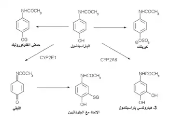 يُستقلب الباراسيتامول بصورة أساسية في الكبد، حيث تتضمن مستقلباته الأساسية مترافقات الكبريتات والغلوكورونيد الخاملة التي تُطرح كلوياً. ولكن تبقى كمية صغيرة نسبياً تستقلب بنظام السيتوكروم "ب450" الكبدي وينتج المستقلب الهامشي (ن-أسيتيل-بارا-بنزو-كينون إمين، ويُختصر نبقي NAPQI) المسؤول عن التأثيرات السامة للباراسيتامول.