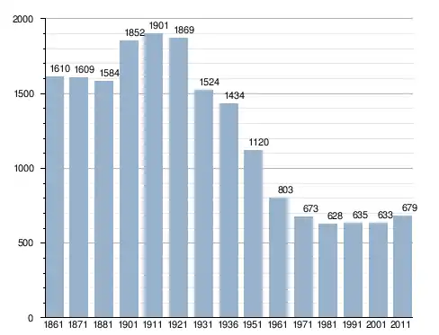في سنة 1861 بلغ عدد السكان 1٬610 نسمة، وتطور العدد ليصل في سنة 2011 لـ 679 نسمة.