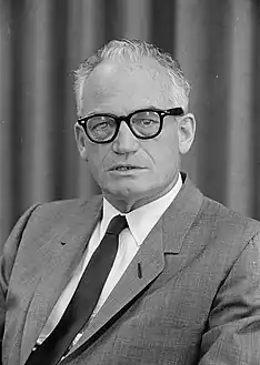 كان باري موريس جولدواتر (بالإنجليزية: Barry Goldwater) (2 يناير 1909[11] – 29 مايو 1998) سياسيًا أمريكيًا، ورجل دولة، ورجل أعمال، وجنديًا، ومؤلفًا، وكان عضوًا في مجلس الشيوخ لمدة خمس فترات لولاية أريزونا (1953-1965، 1969-1987)، وعضوًا جمهوريًا مرشحًا لمنصب رئيس الولايات المتحدة في عام 1964. جولدواتر هو السياسي الذي يُنسب إليه الفضل في كثير من الأحيان في إشعال شرارة عودة حركة السياسية المحافظة الأمريكية في ستينيات القرن العشرين. على الرغم من خسارته الساحقة في الانتخابات الرئاسية عام 1964، يعتقد عدد من النقاد والمؤرخين السياسيين أنه وضع الأساس للثورة المحافظة التي ستتبعها، حيث بدأ التنظيم الشعبي واستيلاء حزب المحافظين على الحزب الجمهوري في إعادة ترتيب السياسة الأمريكية التي ساعدت في تحقيق «ثورة ريغان» في ثمانينيات القرن العشرين. كما كان له تأثير كبير على الحركة الليبرتارية.[12]