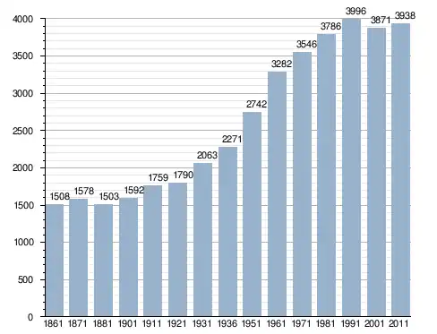في سنة 1861 بلغ عدد السكان 1٬508 نسمة، وتطور العدد ليصل في سنة 2011 لـ 3٬938 نسمة.