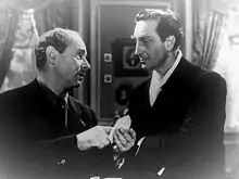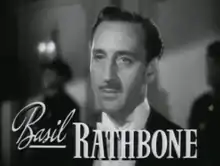 باسل راثبون (بالإنجليزية: Basil Rathbone) ممثل سينمائي ومسرحي إنجليزي (13 يونيو 1892 - 21 يوليو 1967) برز اسمه على المسرح الشكسبيري، واشتهر في السينما بدور شرلوك هولمز.[11] كما شارك في أكثر من 70 فيلم، معظمها تاريخي، وكانت مشاركاته في أفلام مقتبسة من أعمال من أدبية مثل المتعنترون وشارك أيضاً في بعض أفلام الرُعب. ورُشِّح للفوز بجائزتيّ أوسكار أحدها عن دوره في فيلم روميو وجولييت، والأخرى عن دوره في فيلم لو كنت الملك.[12]