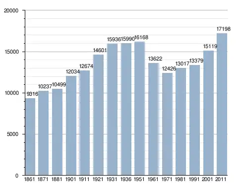 في سنة 1861 بلغ عدد السكان 9٬316 نسمة، وتطور العدد ليصل في سنة 2011 لـ 17٬198 نسمة.