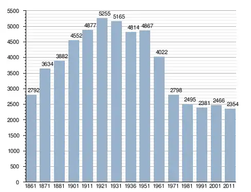 في سنة 1861 بلغ عدد السكان 2٬792 نسمة، وتطور العدد ليصل في سنة 2011 لـ 2٬354 نسمة.