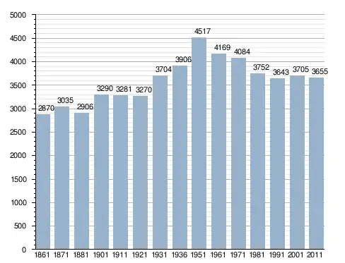في سنة 1861 بلغ عدد السكان 2٬870 نسمة، وتطور العدد ليصل في سنة 2011 لـ 3٬655 نسمة.