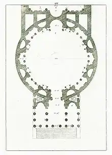 زمنياً، تم بناء القاعة الدائرية أولاً، ثم الجزء الأمامي منها، وأخيراً البروناوس (الرواق) [32].