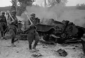 ![]() جنود فنلنديون يحملون بازنر فاوست وتظهر بجانبهم دبابة تي-34 سوفييتية مدمرة. | |