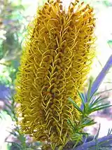 ![]() بانكسيا خلنجية الأوراق زهور ذات لون أصفر غير عادي، في برعم الطائفة في وقت متأخر. قرب شلالات كريك،فى نيو ساوث ويلز |