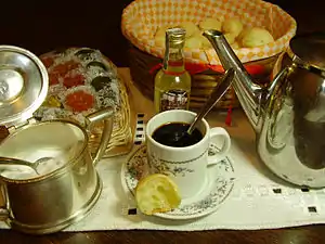 باودجيكايجو بفنجان القهوة وقزازة كاشاسا صغيرة وهم منتجات تقليدية من ميناز جرايز، والباودجيكايجو الذي أُكل منه يظهرداخليته