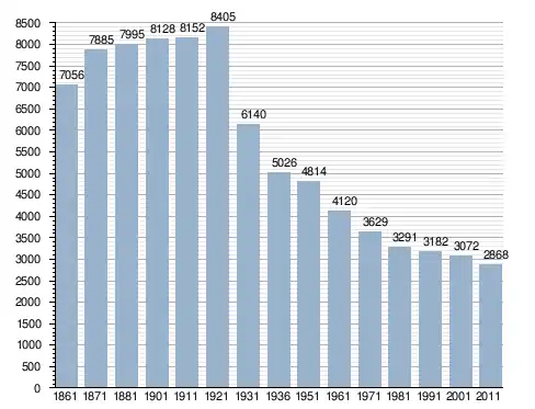 في سنة 1861 بلغ عدد السكان 7٬056 نسمة، وتطور العدد ليصل في سنة 2011 لـ 2٬868 نسمة.