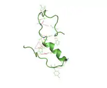| هيكل مطوي جزئيًا لببتيد بيتا النشواني (1 40) في بيئةٍ مائيةٍ (pdb 2lfm)[1] | |