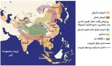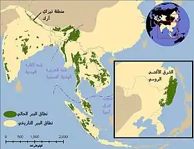 ![]() النطاق التاريخي للببور في حوالي عام 1850 (الأصفر الباهت)، باستثناء نطاق الببر القزويني، ونطاق الببور في عام 2006 (باللون الأخضر).[5] | |
