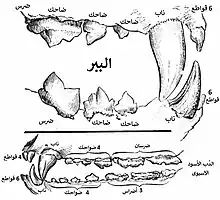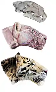 تشبه جمجمة الببر جمجمة الأسد، حيث عادة ما تكون المنطقة الأمامية أقل إنخفاظاً أو مسطحة، والمنطقة خلف محجر العين أطول بعض الشيء. تظهر جمجمة الأسد فتحات أنفية أوسع. نظراً للإختلاف في أحجام الجمجمة للنوعين، فإن بنية الفك السفلي هي مؤشر موثوق به لكشف هويتهما.[36] الببر لديه أسنان قوية بوضوح. أنيابها المقوسة قليلاً هي الأطول بين السنوريات الحية التي يصل إرتفاع تاجها إلى 90 مليمتر (3.5 بوصة).[26]