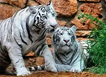 تظهر لدى بعض الببور طفرة معروفة جداً تؤدي إلى ولادتها بلون أبيض، وتعرف هذه الطفرة باسم "الفراء الأبيض" (باللاتينية: chinchilla albinistic)،[47] الببر الأبيض لديه فراء أبيض وخطوط بنية داكنة. والببر الأبيض حيوان نادر في البرية لكنه يُستولد بشكل واسع في حدائق الحيوان بسبب شعبيته الكبيرة. وقد أدى تزويج الببور البيضاء في الأسر إلى عدة مشاكل بسبب التناسل الداخلي، منها ولادة العديد من الجراء بحنك مشقوق أو بجنف في العمود الفقري أو مصابة بالحول.[48][49] ولحلّ هذه المشكلة قام العديد من الأشخاص بتزويج الببور البيضاء مع تلك البرتقالية وغالبا ما قاموا بدمج النويعات المختلفة مع بعضها. تمّ توثيق وجود الببور البيضاء لأول مرة في أوائل القرن التاسع عشر،[50] وقد أظهرت الفحوص العلميّة أن الببر يولد بهذا اللون عندما يحمل كلا الوالدين جينة نادرة، وتبيّن أن هذه الجينة لا تظهر إلا في فرد واحد من ولادة واحدة من أصل 10,000 ولادة. ولا يعدّ الببر الأبيض نويع مستقل كباقي النويعات كما يسود الاعتقاد، بل مجرّد نمط لونيّ مختلف؛ كما لا يعدّ مهدداً بشكل أكبر من النويعات المختلفة عامة، ومن المعتقدات الخاطئة الأخرى أن الببر الأبيض أمهق على الرغم من أن صباغ اللون الأسود يظهر جليّاً في خطوط هذه الحيوانات. تتميز الببور البيضاء بالإضافة لفرائها الأبيض أعينها الزرقاء وأنوفها الوردية. الببر الأبيض يفتقر إلى الفيوميلانين (الذي ينتج اللون البرتقالي)، وله خطوط بنية داكنة قاتمة وعيون زرقاء. يحدث هذا التصبغ المتغير بسبب جين طافر موروث كصفة صبغية ذاتية متنحيّة تحدد بواسطة موقع كروموسومي أبيض. وهو ليس بالمهق حيث إن الصبغات السوداء لا تتأثر بالكاد.[51][52] تغيير طفرة حمض أميني واحد في البروتين الناقل SLC45A2. يحتاج كلا الوالدين إلى أن يكون له أليل للبياض للحصول على أشبال بيضاء.[53] بين أوائل ومنتصف القرن العشرين، تم توثيق ببور بيضاء وإطلاق النار عليها في الولايات الهندية أوديشا، بِهَار، آسام وفي منطقة ريوا في ماديا براديش. بدأ المهراجا المحلي بإكثار الببور في أوائل الخمسينات من القرن الماضي، واحتفظ بِبَبْر أبيض ذكر مع ابنته ذات اللون الطبيعي. كان لديهم أشبال بيضاء.[54] للحفاظ على هذه الصفة المتنحية، تم استخدام عدد قليل من الأفراد البيض في التكاثر بالأسر، مما أدى إلى درجة عالية من التوالد الداخلي. إنحدار زواج الأقارب هو السبب الرئيسي للعديد من المشاكل الصحية للببور البيضاء الأسيرة، بما في ذلك الحول، والموت الجنيني، والتشوهات والموت المبكر.[55] تشمل العيوب الجسدية الأخرى الحنك المشقوق وإنحراف العمود الفقري جانبياً.[56]