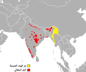 ![]() نطاق الببر البنغالي باللون الأحمر | |