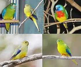 ![]() خمسة أنواع من ببغاوات الأعشاب، من اليمين إلى اليسار وباتجاه عقارب الساعة: الببغاء الفيروزي، الببغاء الأنيق، الببغاء قرمزي الصدر، الببغاء برتقالي البطن، والببغاء أزرق الجناح. | |