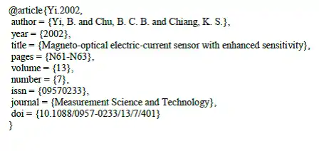 عندما نريد استخدام هذا المرجع فبالإمكان استخدام الأمر "{cite{Yi.2002\" فيظهر المصدر في النص الذي نكتبه برقمه المرجعي، مثلا [1] وفي قائمة المراجع يظهر كالتالي: