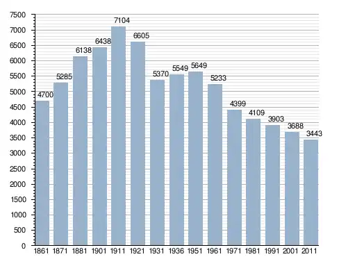 في سنة 1861 بلغ عدد السكان 4٬700 نسمة، وتطور العدد ليصل في سنة 2011 لـ 3٬443 نسمة.