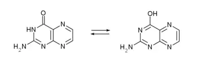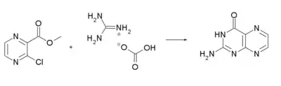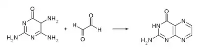 أو من تفاعل 5,4,2-ثلاثي أمينو-6-هيدروكسي البيريميدين مع الغليوكسال:[5]