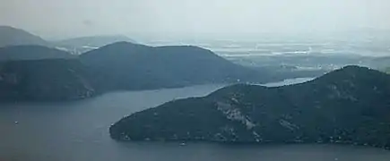 منظر جوي لبحيرة جورج ، مع رؤية أنثوني أنف وروجر روك