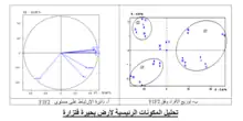 بمراقبة دائرة الارتباط التي شكلتها المحورين F1 و F2، وتبين لنا أن العامل F1 يعبر 72.40٪ من التباين. في هذا المحور، الأملاح الذائبة( Ca++,Mg++,Na+,Cl-,SO4—and EC ) معارضين ل -HCO3 الذي يمثل قلوية الكربونات. هذا هو محور الذي يعكس على الأرجح في نفس الوقت ظاهرة التملح التي تؤثر على أنواع معينة من التربة والقلوية التي تضع على الآخر.