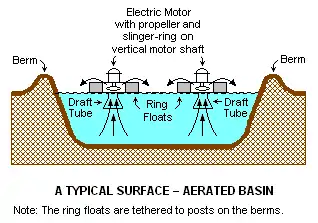تحقق البرك أو الأحواض التي تستخدم مهوّيات أسطح عائمة (80 إلى 90٪) من إزالة الطلب الأوكسجيني البيولوجي (BOD) مع فترات احتجاز من 1 إلى 10 أيام.[6]