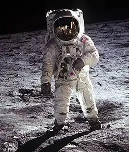 رائد الفضاء "بروس ماكاندليس " مرتديا رداء الفضاء، ولابسا فوقه وحدة مأهولة للمناورة خارج مركبة الفضاء. الصورة من عام 1984، ناسا.