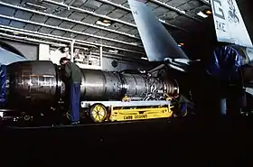 ![]() محرك من طراز تي إف30-بي-412إيه (TF30-P-412A) يجري إعداده للتثبيت على طائرة إف-14 توم كات | ||||
