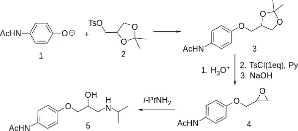 Practolol synthesis:[5] Howe, Smith, NL 6512676; eidem, U.S. Patent 3٬408٬387 (1966, 1968, to I.C.I.).