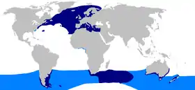 ![]() موطن البربيجل (أزرق داكن) المناطق التي يتأكد وجود البربيجل فيها (أزرق فاتح) المناطق التي يشتبه بتواجد البربيجل فيها | |