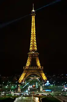 برج إيفل (بالفرنسية: Tour Eiffel) هو برج حديدي يبلغ ارتفاعه 324 مترا، يوجد في باريس، في أقصى الشمال الغربي لحديقة شامب-دي-مارس، بالقرب من نهر السين، أنشئ من طرف غوستاف إيفل ومعاونيه بمناسبة المعرض الدولي لباريس، وبدأ بناءه في 28 يناير 1887، واكتمل في عامين وشهرين و5 أيام (1887- 1889)، وافتتح للجماهير في 15 مايو 1889. وسمي برج 300 متر في الافتتاح، أصبح هذا المنشأ رمز العاصمة الفرنسية والرمز السياحي الأول فيها، ويمثل تاسع موقع فرنسي الأكثر زيارة في 2006، وهو أيضاً أول معلم من حيث عدد الزوار حيث يبلغ عدد زواره 7 ملايين زائر سنويًا.[19] بارتفاعه الذي يبلغ 313,2 متر، بقي برج إيفل لمدة 41 سنة المعلم الأكثر ارتفاعاً في العالم. تمت زيادة ارتفاعه عدة مرات بتثبيت العديد من الهوائيات، ليبلغ ارتفاعه 327 متر منذ 8 مارس 2011. استعمل في الماضي في العديد من التجارب العلمية، ويستعمل اليوم في بث برامج الراديو والتلفاز.