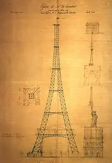 البرج تخيله موريس كشلن وأيميل نوقويي، وهما على التوالي رئيس مكتب الدراسات ورئيس مكتب طرائق إيفل وشركاؤه. أنشأ برج إيفل ليكون جديد معرض باريس 1889 والذي وافق الذكرى المئوية لاندلاع الثورة الفرنسية.تم الانتهاء من المخطط الأول للبرج في جوان/يونيو 1884 وحسنه ستيفان سوف ستري رئيس المهندسين المعماريين للمشروع وأعطاه أكثر أناقة. في 1 مايو 1886، وقع وزير التجارة والصناعة إدوارد لوكراي (Édouard Lockroy)، المتحمس للمشروع، أمرا بفتح مناقصة في إطار المعرض السنوي لـ 1889. فاز بالمناقصة غوستاف إيفل وتم العقد في 8 يناير 1887 وحددت مدة إنجاز البناء. من بين مصادر الإلهام لمشروع البرج، يجب أن يذكر معرض فيتوريو ايمانوال 2 في وسط ميلانو لهندسته المعدنية.
