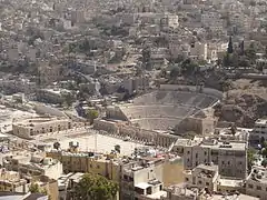 إطلالة من برج المراقبة باتجاه وسط عمّان، ويظهر المدرج الروماني.