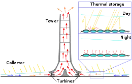 برج التيار الهوائي الصاعد شمسيا هو محطة توليد طاقة متجددة، يمكنه إنتاج الكهرباء من سطوع الشمس، حيث تُسخن الهواء تحت قاعدة لمجمع حراري شاسعة الإتساع يرتفع هيكلها عن الأرض بما يشبه الدفيئة، تحيط بمركز فيه ببرج مدخنة شديدة الارتفاع.[1][2] النقل بالحمل للهواء الساخن يثير تيار هوائيا صاعد داخل البرج حسب مايعرف بتأثير المدخنة. ويمكن لهذا الدفق الهوائي أن يقود عنفات هوائية كانت قد وضعت داخل الدفق الصاعد للمدخنة أو حول قاعدتها لإنتاج الكهرباء.