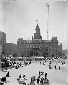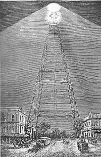 في عام 1881، تم تشييد برج يبلغ طوله 237 قدما (72 مترًا) تقرييا،[10] في تقاطع شارع سانتا كلارا مع شوارع السوق في سان خوسيه، كاليفورنيا، مما يجعلها أول مدينة تضاء بالضوء الكهربائي غرب جبال روكي.[11] انهار البرج في عاصفة 3 ديسمبر 1915.[12] يرجع الفضل في تشييد البرج إلى جيمس جيرومي، الناشر في صحيفة سان خوسيه ميركوري نيوز بعد زيارته لأول محطة إضاءة كهربائية في سان فرانسيسكو في عام 1879.[13][14]
