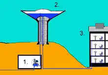 برج المياه هو خزان مائي يبنى على أرتفاع عالي من أجل الاحتفاظ بموارد مائية وتوليد الضغط على نظام توزيع المياه. يتولد الضغط كلما ارتفع خزان المياه؛ فلكل 10.2 سنتيمتر من الارتفاع ينتج 1 كيلو باسكال من الضغط وعلى ذلك ينتج أرتفاع 30 مترا ما يقرب من 300 كيلو باسكال من الضغط وهو ما يكفي لتوفير الضغط لمتطلبات نظام لتوزيع المياه للأغراض المنزلية.