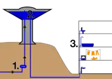 ويحدث الضغط من خلال نظام الضغط الهيدروليكي لارتفاع من الماء لكل 10-20 سنتيمتر (4.016انش) ينتج عنه 1 كيلوباسكال من الضغط ومن هنا على ارتفاع 30 مترا (98.43 قدم) نحصل على 300 كيلوباسكال من الضغط وهو ما يكفي لضخ المياه داخل إمدادات نظام التوزيع.