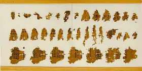 آثار البرديات الباقية مكتوبة في أعمدة مقسمة إلى ثلاث قوائم أفقية.[6]