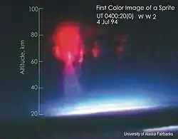 عفاريت البرق هي على نطاق واسع التفريغ الكهربائي التي تحدث في منطقة عالية فوق العواصف الرعدية، مما يؤدي إلى مجموعة متنوعة جدا من الأشكال البصرية. والتي هي نتيجة قبل تصريف البرق الموجب بين الرعدة والأرض. وسميت هذه الظواهر بالعفاريت (بالإنجليزية: sprite) تيمنا بالروح الشريرة "باك" (روح الهواء) المذكور في رواية ويليام شكسبير حلم ليلة صيف. و عادة ما يكون لونها برتقالي محمر أو أخضر أو أزرق، مع محلاق متدلي وفروع مقوسة في الأعلى. ويمكن أيضا أن يسبقه هالة حمراء. وغالبا ما تحدث في مجموعات، بعلو 50 كم وحتى 90 كلم فوق سطح الأرض. صورت لاول مرة يوم 6 يوليو، 1989 من قبل علماء جامعة مينيسوتا شوهدت منذ ذلك الحين عشرات الآلاف من المرات.[3] اعتبرت العفاريت مسؤولة عن حوادث عديدة غير مبررة حدث على علو شاهق الارتفاع فوق مسرح عمليات العواصف الرعدية[4]