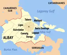 تشارك في الموقع 8 مقاطعات من ضمنها كاماليغ ، و ليغاو ، و تاباكو ، وسانتو دومينغو ، تحيط به.