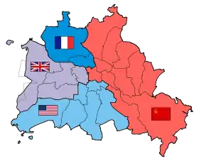 برلين الغربية وهو الجزء الغربي من مدينة برلين عاصمة ألمانيا والذي كان تحت سيطرة ألمانيا الغربية من سنة 1949 إلى سنة 1990 وكان يُقابل برلين الغربية من الشرق جدار برلين الذي فصلها عن برلين الشرقية عاصِمَة ألمانيا الشرقية والذي بُني في سنة 1961 وحَطَمَهُ الألمان في سنة 1989 والذي كان طريقاً لإعادة توحيد ألمانيا، وقد كانت برلين الغربية مُحاطة من كُل الجوانب بألمانيا الشرقية.[1]