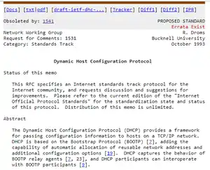 |CitationClass=تم تجاهله (مساعدة) - T'Joens, Y.; Hublet, C.; De Schrijver, P. (ديسمبر 2001). "RFC 3203, DHCP reconfigure extension". The Internet Society (باللغة الإنجليزية). مؤرشف من الأصل في 11 أغسطس 2012. اطلع عليه بتاريخ 3 يونيو 2018. الوسيط