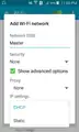 نافذة إضافة شبكة جديدة في نظام الشتغيل أندرويد نوجا 7.0، وتظهر فيها خيارات ضبط إعدادت بروتوكول الإنترنت إلى التهيئة الآلية باستعمال بروتوكول التهيئة الآلية للمضيفين.