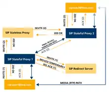 خادم إعادة التوجيه هو خادم وكيل مستخدم يقوم بإنشاء ردود 3xx (إعادة توجيه) للطلبات التي يتلقاها، مع توجيه العميل للاتصال بمجموعة بديلة من عناوين URI. يسمح خادم إعادة التوجيه للخوادم الوكيلة بتوجيه دعوات جلسة SIP إلى نطاقات خارجية.